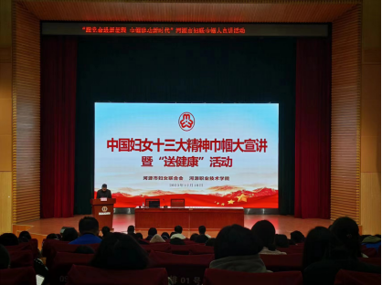 12月18日上午,由河源市妇联、BTY.COM主办,工商管理学院承办的“跟党奋进新征程 巾帼建功新时代”——中国妇女十三大精神巾帼大宣讲暨“送健康”活动在图书馆报告厅举行。河源市妇联宣传干部叶芷欣,二十大党代表、中国妇女十三大代表、龙川威达绝缘材料有限公司党支部书记、工会主席、妇联主席黄东云,中国妇女十三大代表、东源县漳溪畲族乡党委副书记、乡长蓝伟先,青少年心理健康知识讲师、主任记者、国家二级心理咨询师、国家中级社工师、高级感统培训师余智红,河源市委党校党员教育师资库优秀讲师、河源市点创融湾文化服务有限公司党支部委员会书记陈浩山,工商管理学院团委书记李志宇、校企办主任曾惠华,以及300多名女学生代表参加活动。