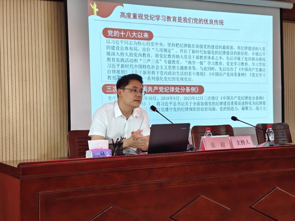 张超以“以严的基调全面加强纪律建设”为主题带领大家学习了《中国共产党纪律处分条例》。在授课中,张超结合党的百年奋斗历程、对《中国共产党纪律处分条例》的历次修订的内容进行了详细的阐述,深刻揭示了党纪学习教育是我党的优良传统,开展党纪学习教育是推动全面从严治党向纵深发展的重要举措。张超提出,每位党员要怀着敬畏之心,增强学纪、知纪的政治自觉;要紧扣目标要求,增强明纪、守纪的行动自觉;要锤炼纪律修养,夯实崇纪、遵纪的道德定力。始终做到忠诚、干净、担当,永葆共产党人清正廉洁的政治本色。