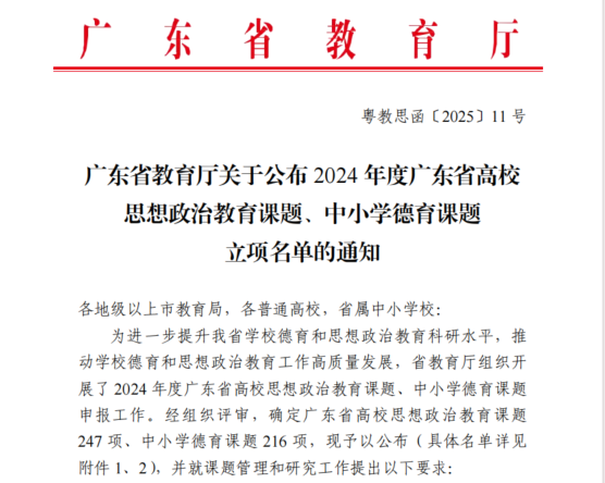 近日,2024年度教育科学规划课题(德育专项)和广东省高校思想政治教育课题立项名单相继公布,我院教师在此次课题申报中表现突出,共立项省级课题4项。其中,杨婷老师主持的课题《教育数字化时代中华优秀传统文化融入高校思想政治教育的路径研究》成功获批2024年度教育科学规划课题(德育专项)立项,同时,徐微、张伟东、郭慕卿三位老师分别主持的课题也成功获批2024年度广东省高校思想政治教育课题立项。