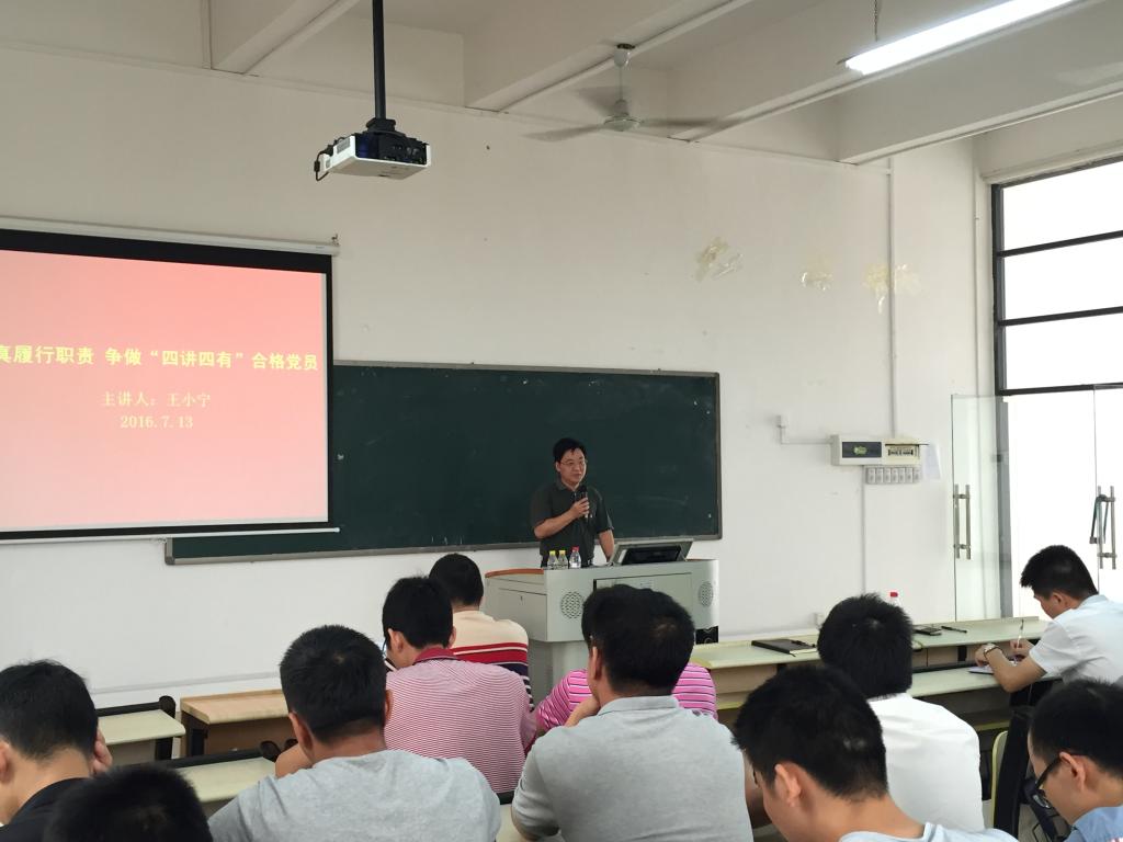 7月13日,王小宁副校长在实训楼B306为机电工程学院全体党员老师讲授“认真履行职责,争做‘四讲四有’合格党员”党课。