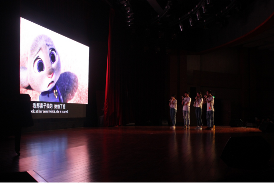 随后,人文学院社团部带来的舞蹈表演《Greedy》,以轻快的舞蹈拉开了本次电影配音大赛决赛的帷幕。而本次决赛共6组选手同台竞技,每组分别进行常规版和创意版两次的电影配音。参赛小组的默契配合,惟妙惟肖的配音,富有创意的改变,为现场观众呈现了一场视听的盛宴。其中,来自 “新年快乐”小组配音的电影《疯狂动物城》,流畅的英语,声情并茂地还原电影情节,获得评委嘉宾的高度认可,并荣获了本次决赛的一等奖。“小西瓜”小组带来的电影配音《最美时光遇见你》,幽默诙谐的语言,贴近配音大赛的创意改编,赢得现场观众热烈的掌声,并荣获了本次决赛的二等奖和最佳创意奖。