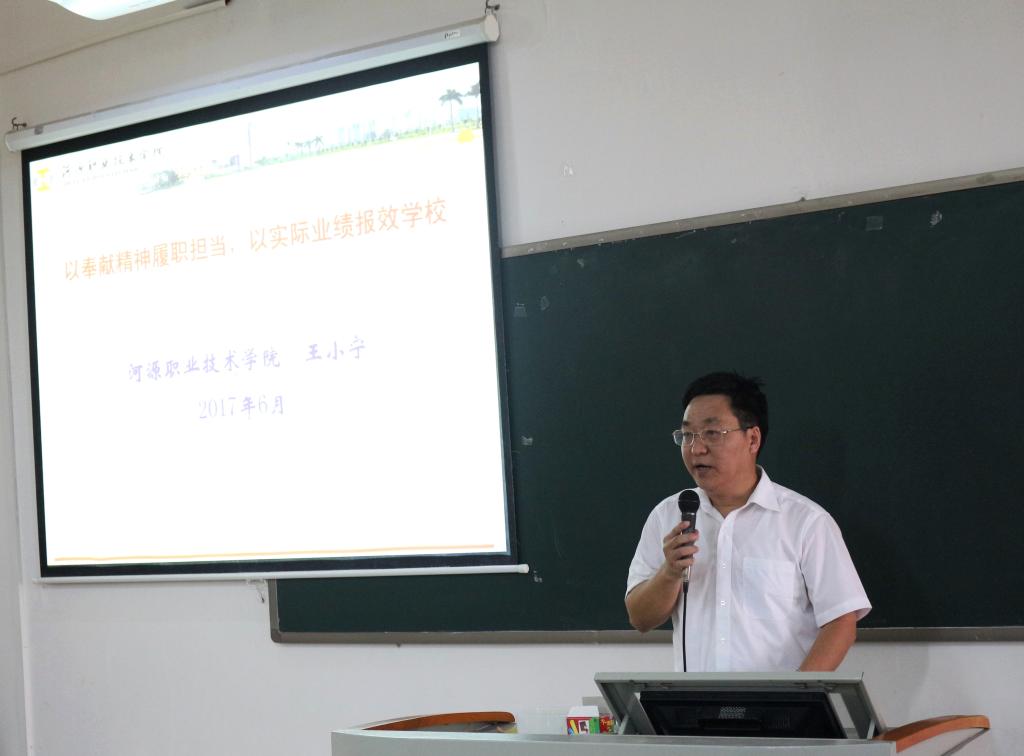 王小宁副校长在“以奉献精神履职担当,以实际业绩报效学校”的主题党课中,向老师们诠释了奉献的含义,提出了在学校快速发展中老师应注意克服的问题,呼吁老师们要更好地履职担当,把握职业教育发展的好时机,紧紧围绕把学校建设成为山区最好、省内一流、国内领先的高职院校目标定位不放松,增创佳绩,撸起袖子加油干。