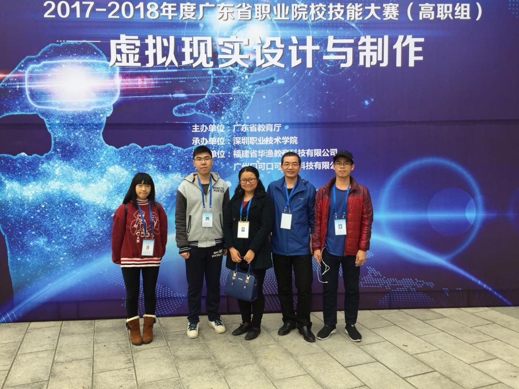日前,由广东省教育厅主办、深圳职业技术学院承办的2017-2018年度广东省职业院校技能大赛(高职组)虚拟现实设计与制作大赛在深圳职业技术学院举行。我校电信学院高燕老师和罗建华老师指导的15级计算机多媒体技术专业余君云、周洁兰同学和15级嵌入式应用技术专业吴浩文同学组成的代表队参加比赛,并最终获得全省排名第5的优异成绩,荣获二等奖。