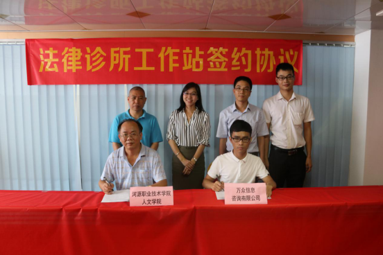 在签约仪式上,徐微老师介绍了我校法律专业的建设情况,提出专业的就业及未来发展存在的困难,希望通过进一步的校企合作,为法律学生提供更多的实习和就业机会。龙川县万众信息咨询有限公司负责人介绍了该公司的业务情况,同时指出基层缺乏专业法律人才,特别是乡镇老百姓的法律意识淡薄,维权比较困难,在龙川挂工作站牌不但能够服务更多有需要人士,也让学生直接接触基层案件,得到更多的锻炼,希望双方今后加强合作,实现共赢。