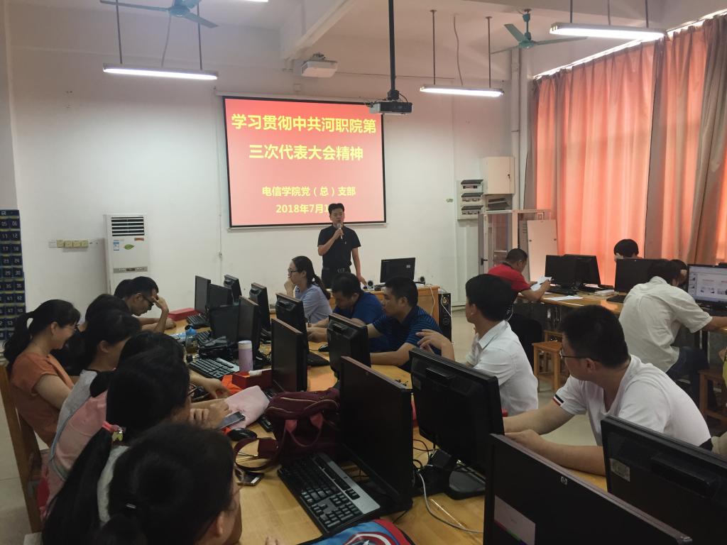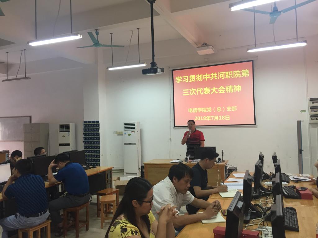 2018年7月18日下午,我院在实训楼A213召开学习贯彻中国共产党BTY.COM第三次代表大会精神会议,学院全体教职工参加了本次会议,由学院副书记徐国辉主持。