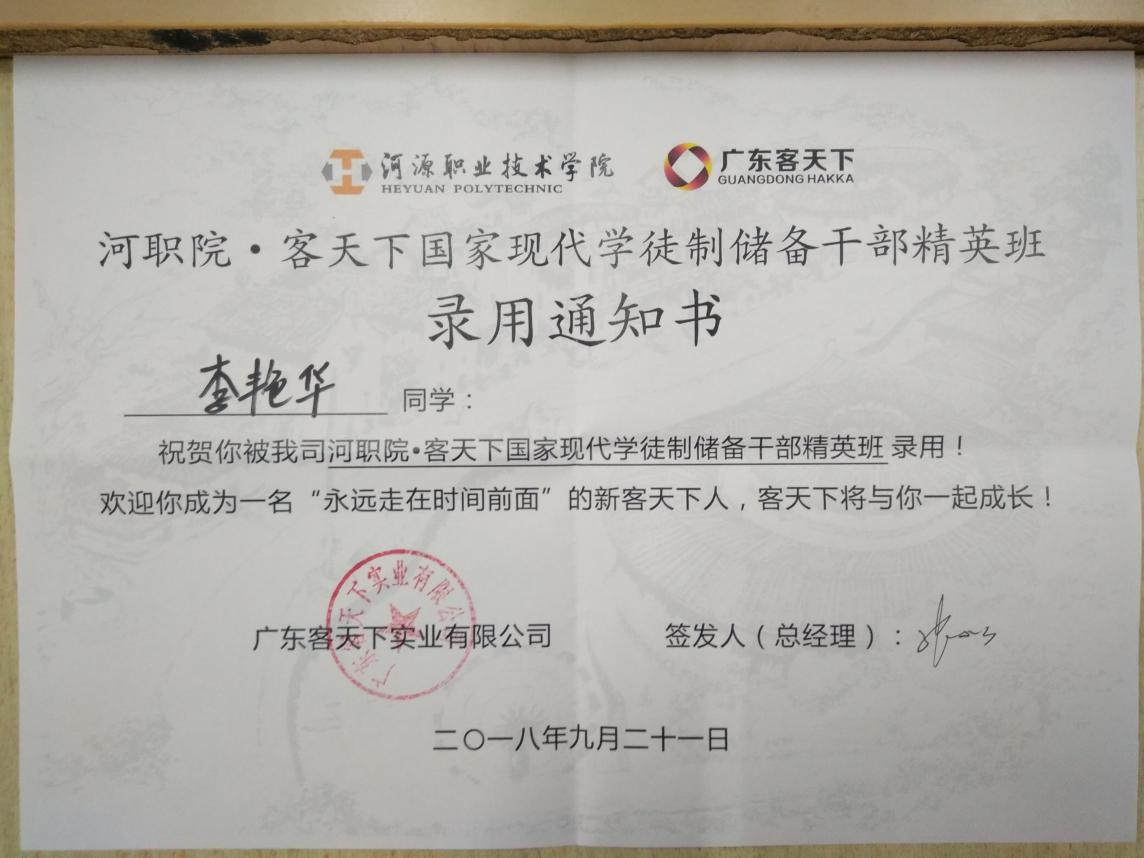 河职院·客天下国家现代学徒制储备干部精英班录用通知书