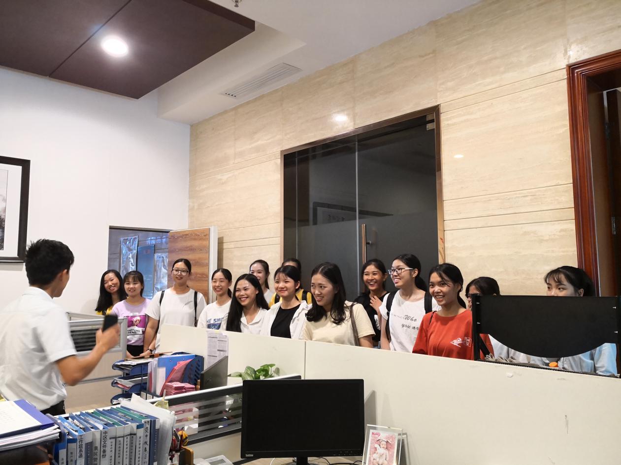 9月18日,66名新生在曾惠华主任、班主任潘蕾老师的带领下参观客天下。在企业里,同学们分三组分别到一线和内勤部门、员工宿舍、员工活动场所参观,所到之处,都有河职院毕业的师兄师姐对各部门的情况进行介绍,让同学们全面、深入了解企业各部门的运作和企业文化。